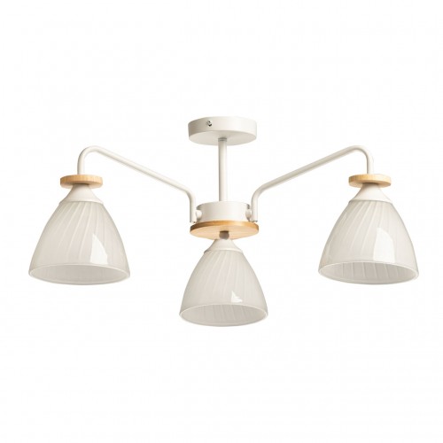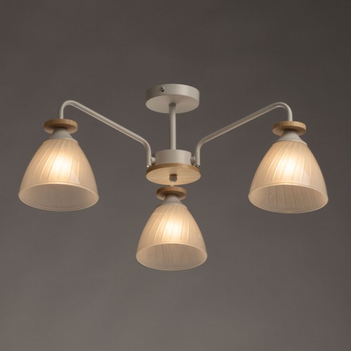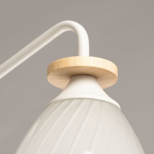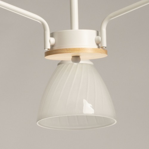 Металлическое основание потолочной люстры окрашено в белый цвет. Стеклянные плафоны отлиты в форму и окрашены в белый цвет с внутренней стороны. Светильник декорирован элементами из натурального светлого дерева.