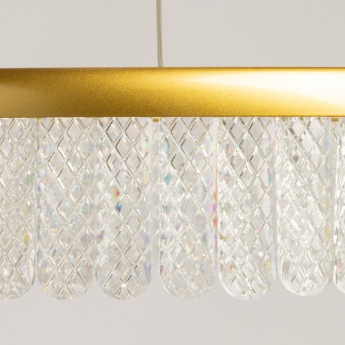 Светильник Орион подвешен на прочных металлических тросах, что создает эффект лёгкости и воздушности. Общая высота светильника составляет 90 см, и благодаря возможности регулировки, он прекрасно впишется в помещения как с высокими так и со стандартными потолками. Основание выполнено из качественного металла, который был гальванизирован в элегантный золотой цвет. Этот роскошный оттенок не только добавляет изделию изысканности, но и гармонично сочетается с различными стилями интерьера — от классического до современного минимализма.Светильник Орион оснащен современными светодиодами мощностью 58W, что обеспечивает яркое и эффективное освещение. Он способен осветить помещение площадью до 16 квадратных метров, что делает его идеальным решением для гостиных, кухонь или детских комнат. Кроме того, светильник оснащен пультом, который позволяет регулировать температуру света в диапазоне от 3000 до 6000 K. Это дает возможность создавать различные атмосферные эффекты в зависимости от времени суток или настроения, будь то уютный теплый свет для вечерних посиделок или яркий холодный свет для работы или учебы.Плафон светильника украшен подвесками из прозрачного хрусталя с необычными гранями, которые придают изделию дополнительную изысканность. Эти хрустальные элементы не только играют с светом, создавая красивые отражения, но и добавляют нотку роскоши в общий дизайн.Лаконичный и современный дизайн светильника Орион соответствует актуальным тенденциям в мире освещения. Простота форм и отсутствие лишних деталей делают его универсальным элементом, который легко вписывается в любой интерьер. Светильник может использоваться как самостоятельный источник света, так и в сочетании с другими осветительными приборами, создавая гармоничное освещение в пространстве.
